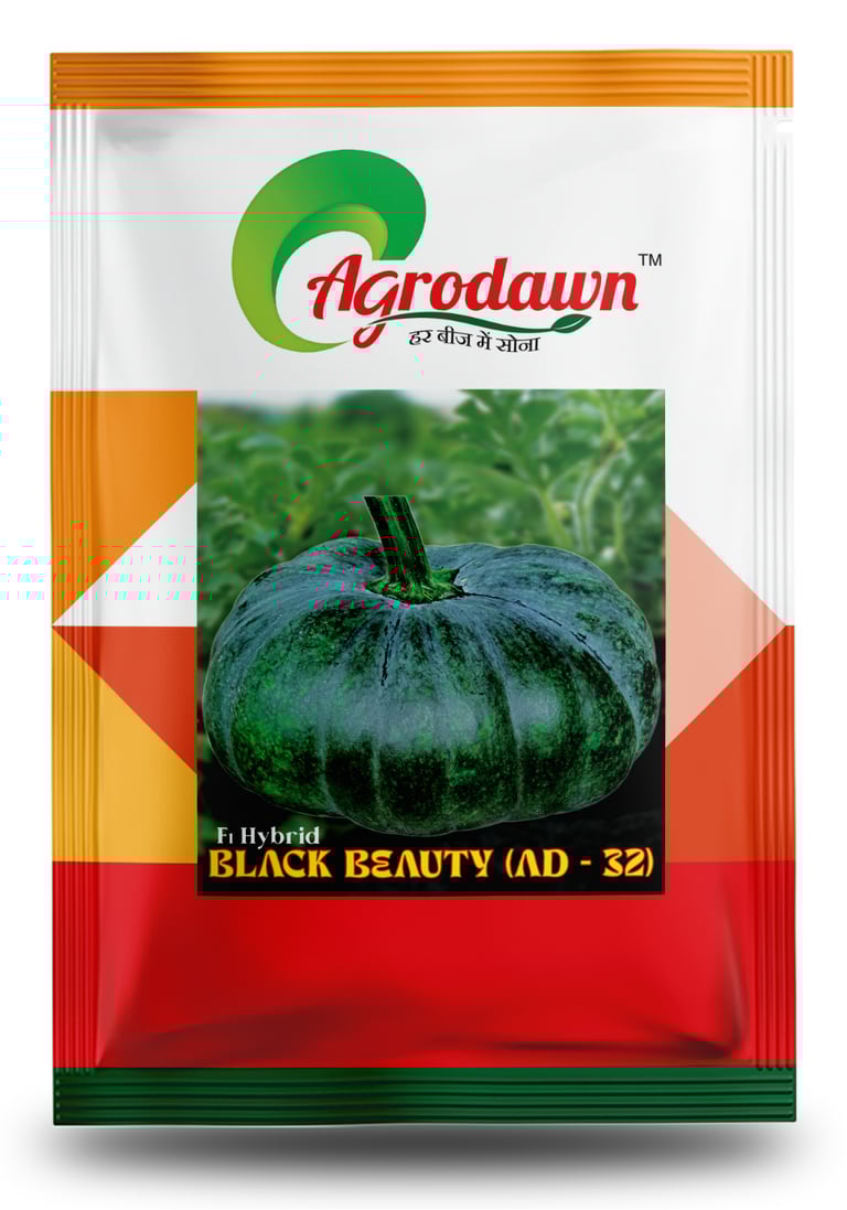 Pumpkin Black Beauty grows quickly and produces lots of fruit in just 70-80 days. It makes Smooth and slightly ridged flat-round fruits with a pretty dark green color. Each fruit is big, weighing around 3.5 to 4.5 kg, and inside, the flesh is a bright orange color with a smooth texture. Plus, it's easy to grow in many different places and gives you a big harvest.