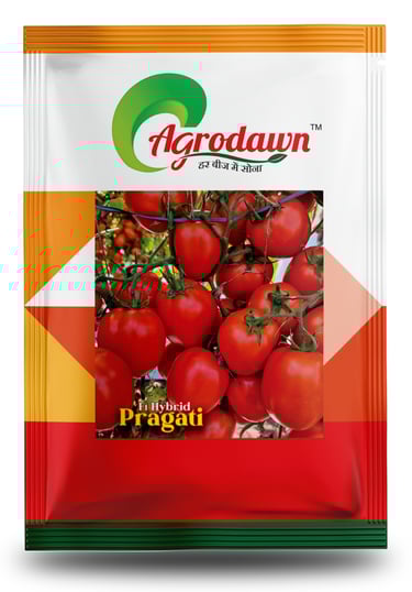 Pragati is a unique F1 hybrid tomato variety with medium foliage cover, early maturity, and excellent re-flushing. It has a good heat set, high yield potential, and tolerance to TY LCV, making it suitable for BW-prone areas. Uniform red, medium square-round fruits yield 25–30 MT/acre (80–130g each). Sowing: Rabi, Summer (frequent irrigation), and Rainy (minimal irrigation).